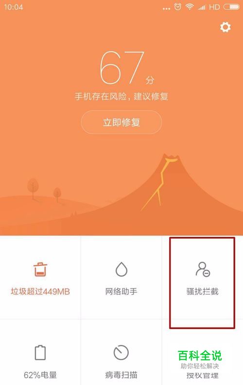 进入安全中心后我们可以看到手机的评分之类的,可以在此界面清理手机垃圾,同时可以进行骚扰拦截的设置。