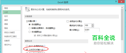 4、在公式选项卡总的“使用公式”分类下,可以发现“公式记忆式键入”前面没有打钩,我们要将其打钩√才能,恢复公式的提示功能。 现在我们将其打钩√,并点击确定。