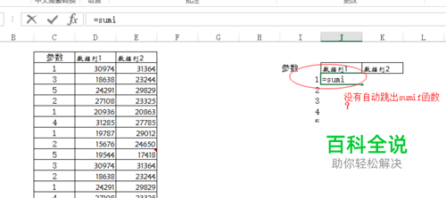 假设我们有以下如图数据,我们想要按条件求和,但是输入公式一半(如sumi),却没有剩余公式的提示。 其实有2情况会导致这种结果。