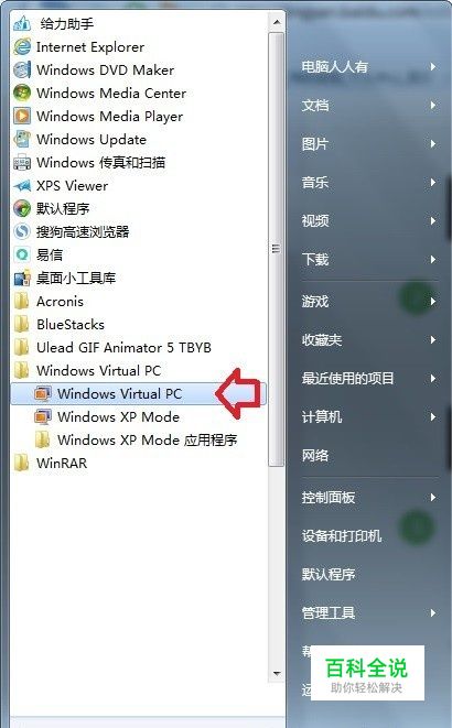 点击Windows7操作系统中的开始菜单→所有程序→Windows Virtual PC→双击打开Windows XP Mode。