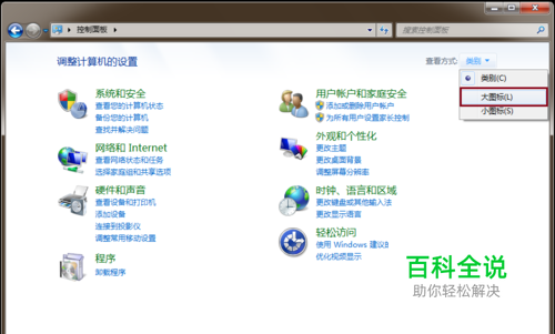 初次打开的“ 控制面板”是比较简洁的,因为默认情况下,控制面板是按照“ 类别”分类展示的。因此,为了方便查找,我们先将其切换到“ 大图标”显示。