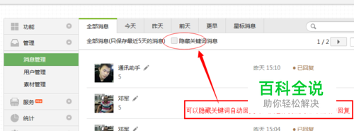 进入微信公众平台的后台,找到消息管理这一栏。