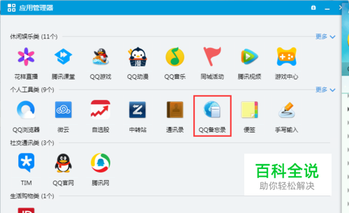 打开QQ客户端主面板,在最下面一排工具类按钮上,如果您是首次使用QQ备忘录功能,默认工具栏是没有展示的,需要点击最后面的应用管理器按钮,打开应用管理器,在个人工具类可以看到QQ备忘录