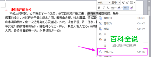 1.删除线和着重号 如果你想对某段文字要进行修改,要保留删除文字痕迹,那么就需要用到删除线 如果是要特别强调的,就需要用到着重号。选中要加删除线的文字内容,右击,选中“字体...”如图所示