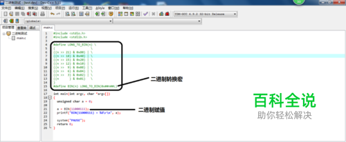 利用二进制宏可以解决C语言不能直接使用二进制量的问题,宏核心代码如下: #define LONG_TO_BIN(n) \ ( \ ((n >> 21) & 0x80) | \ ((n >> 18) & 0x40) | \ ((n >> 15) & 0x20) | \ ((n >> 12) & 0x10) | \ ((n >> 9) & 0x08) | \ ((n >> 6) & 0x04) | \ ((n >> 3) & 0x02) | \ ((n ) & 0x01) \ ) #define BIN(n) LONG_TO_BIN(0x##n##L) 我们可以直接使用BIN(11100111)这种形式来使用常量,这就是最直观的二进制形式,非常方便,下载我们新建工程,测试代码如图: