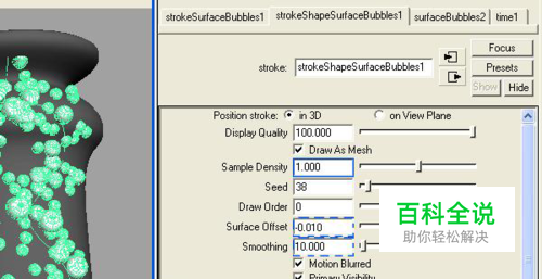 完成你的绘图泡沫后,你需要修改以下属性: Stle Density:增加或减少泡沫的密度。 Surface Offset:控制对象之间的距离。 Smoothing:平滑泡沫路径(基本曲线)。 对我来说,Stle Density 0.6,Surface Offset -0.010,Smoothing 10。