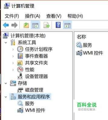 右键此电脑,点击管理(G),第一列最后找到服务和应用程序,点开找到服务。