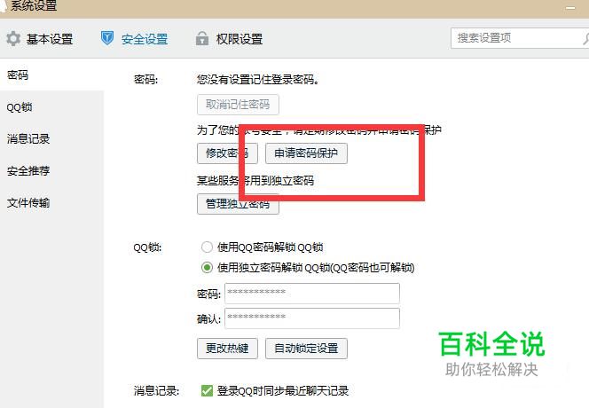 我们点开QQ“设置”,找到“安全设置”,在“密码”这个版块里,我们看到有一个“申请密码保护”按钮,从这个按钮点击进去就可以设置密码保护。
