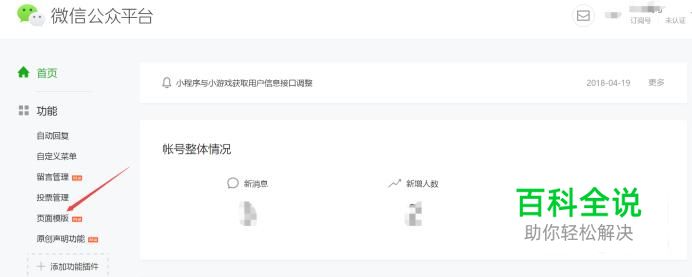 登录微信公众号之后,在首页面中找到“页面模板”选项。