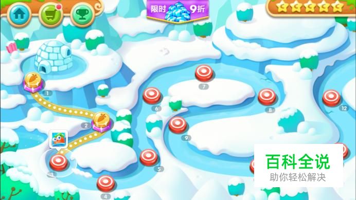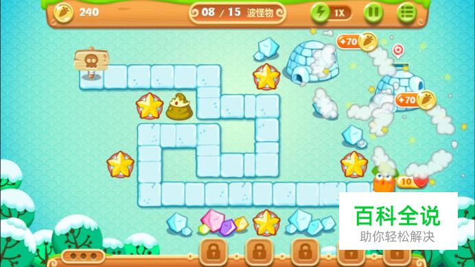 道具清除以后你就会获得金币,在靠近出口的地方安装一个炸弹星,接着将中间那个冰淇淋清除,在靠近出口的地方安装一个便便用来减速