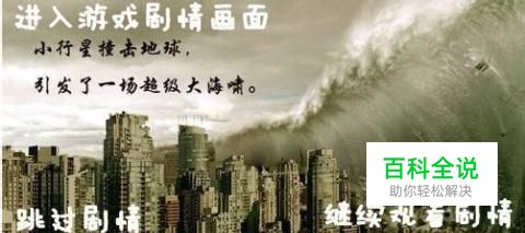 进入游戏后会出现剧情画面,左下方有个跳过按键,点击即可跳过剧情,右下角的继续,是用来继续观看剧情的(如图所示)。第一页的剧情是讲一颗小型星撞击了地球,造成了一场超级大海啸,可以看到画面上的巨大海浪,淹没了城市(如图所示)!我们点击右下角的继续。