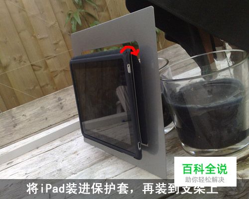 把iPad装进保护套内,露出显示屏。套盖后翻,再安装到杂志架上试一试。