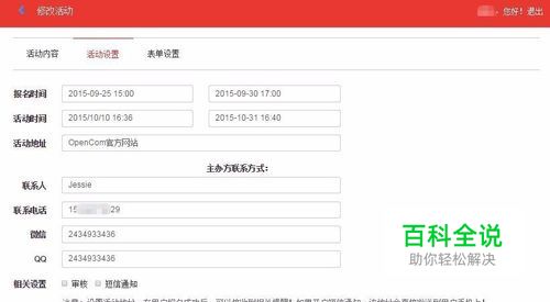 填写好活动设置:活动报名时间、活动开始时间、活动地址、主办方联系方式。 (注:1.勾选“审核”时,参与活动报名的人需要运营者审核,才能参与活动,默认设置为不开启状态。 2.勾选“短信通知”时,需要运营者在已购买短信包的情况下支持短信通知到用户留下的手机号码,获取短信支持>>>>>点我吧)