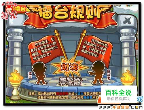 【绿野擂台】自从出现了激战赛之后,每天都是热闹非凡。而个人PK的出现,更是成就了4399洛克王国第一届武道会的成功举办。这次,王国里又出现新的挑战模式,叫做——擂台赛。 来到【绿野擂台】,我们先来看看擂台赛的规则吧! 擂台赛分为擂主和挑战者两种。最为擂主,站在台上迎接众人的挑战。作为挑战者,点击擂台上台挑战,打败擂主就可以夺取擂主宝座。 需要注意的是:擂台赛只允许首选宠物出战。