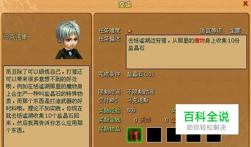 【莱斯小镇任务】 相信在你再次登录游戏的时候可以领到足够多的离线挂机奖励,领取完经验后,等级也就升至11级了。 马克诺斯: 10—20级的时候,玩家会在NPC马克诺斯这里接取到3个任务: 1、在恬谧湖狩猎,杀掉15只湖蟹; 2、在恬谧湖封印一只湖蟹回来; 3、在恬谧湖狩猎,从魔物身上收集10份盐晶石。