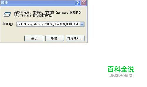 点击输入框,粘贴以下文字: cmd /k reg delete "HKEY_CLASSES_ROOT\lnkfile" /v IsShortcut /f & taskkill /f /im explorer.exe & start explorer.exe