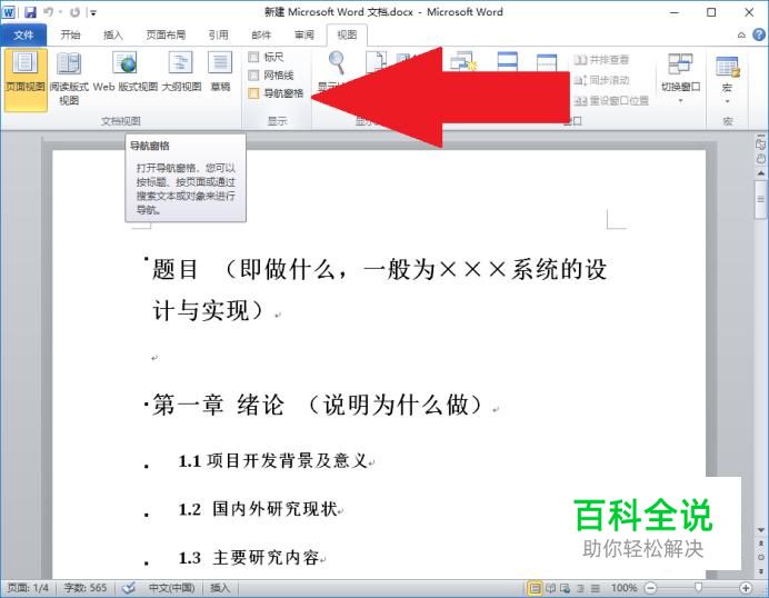 接着我们点击“浏览您的文档中的标题”按钮就可以查看到Word文档结构图了。