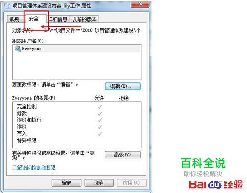 此时就可以修改用户权限了。右键单击不能删除的文件,在右键菜单中选择“属性”。并在弹出的属性对话框中选择“安全”栏。选择“编辑”选项。