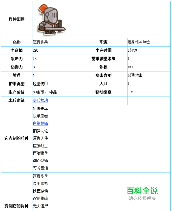 小小帝国中短脚步兵是最基础的兵种,玩家在游戏最开始时就可以招募短脚步兵。招募短脚步兵的主要建筑是步兵营地,步兵营地在升级后还可招募蓝皮巨魔。下面就由小编为大家带来小小帝国短脚步兵图文详解。 小小帝国短脚步兵详解: 短脚步兵是近距离攻击单位,他是等级最低的兵种,所以当城堡建成时,就可以生产该兵种,但是短脚步兵可以在铁匠铺升级,升级后的短脚步兵会变强。 短脚步兵等级为1时 ,其生命值为290,攻击力为14,生产时不需要魔晶石 升级短脚步兵的建筑:铁匠铺 具体情况如下: 由于短脚步兵攻击距离较短,只有1,所以一般放在部队的第一排,战斗中可适当地增加短脚步兵的人数,随着城堡的升级,我们也会见识到越来越多的兵种和建筑。