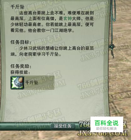 这个任务比较特别,是红色问号的,奖励技能千斤坠,完成任务获得任务任务奖励: 阅历:2000;招式:千斤坠;