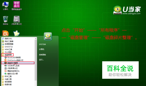 进入PE系统后,依次点击“开始”——“所有程序”——“磁盘管理”——“磁盘碎片整理”。