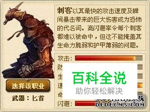 刺客如何加点 首先,进入了游戏,在勇士小镇的加点无所谓,之后选人和国家都会有一次免费自动洗点。那么之后的加点趋向呢?如果你是对CK的职业特点比较痴迷的,或者你是非RMB玩家,你可以直接全部加敏捷。 如果你觉得CK的血量很少,而你又有RMB后期洗点,那么你可以加敏捷到够穿装备,其他加精力。这两种加法,我一直选择前一种,全敏捷加法的好处是闪避加成高,加精力自然是血多点,有人称为血刺客。