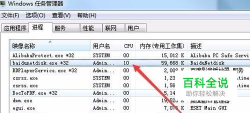在打开的资源管理器窗口中,找到baidunetdisk进程,可以看到有时占用率达到100%的情况。