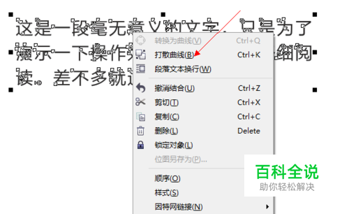 转换为曲线后,我们右击鼠标,【打散曲线】,快捷键:CTRL+K。这个时候,我们发现有些文字的内部自动进行了填充。 没有关系。现在我们可以用【挑选工具】把不要的文字部分进行选择删除了。