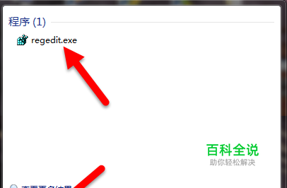 在输入框中输入命令regedit,系统将会自动查找regedit的可执行程序并显示。点击结果中显示的regedit.exe程序。