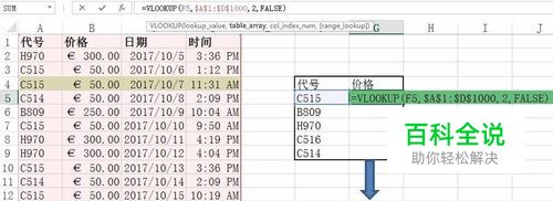 我们把公式摆出来:vlookup(查找值,区域范围,列序号,精确匹配/近似匹配) 现在来找代号C515对应价格: 查找值C515对应的是单元格F5;区域范围是左侧A1:D1000,加$保证绝对引用$A$1:$D$1000(固定区域范围,以免下拉填充范围变动出错);价格位于第二列,序号为2;精确匹配,FALSE 这样就写出了查询函数:=VLOOKUP(F5,$A$1:$D$1000,2,FALSE)