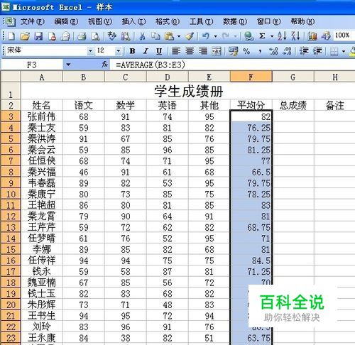 上面的图片里面咱们就看到了,平均成绩也被算在了总成绩里面了,这样的结果不是咱们要的,那么怎么解决呢?一共有两种方法:一种是手动的改写,我们可以将公式改成(B3+C3+D3+E3)在点击回车就行。