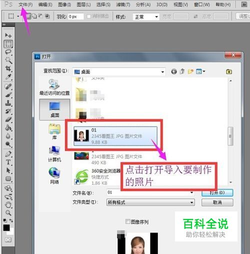 进入PS后,打开左上角的文件,导入要制作的照片。