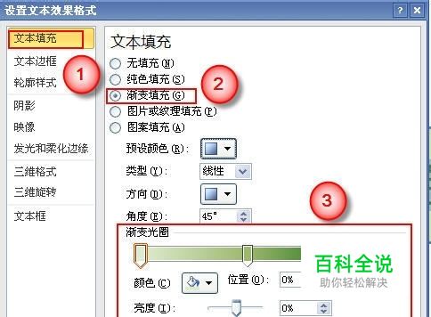 选择“文本填充—>渐变填充”,可以调整渐变光圈、颜色、亮度、透明度,达到自己想要的那种渐变效果。