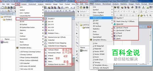 我们介绍过如何合并Origin中的图形使多幅图形在同一个Graph中呈现,但需要在Merge窗口进行设置。而其实Origin提供了很多现成的多屏图Mulit Panels的模板。如图分别是Origin9.1和Origin8.0的多屏图命令的截图,Origin9.1的多屏图从上至下分别是Vertical 2 Panel(垂直2屏图)、Horizonal 2 Panel(水平2屏图)、4 Panel、9 Panel、Stack(重叠多屏图)和Multiple Panels by Label(带标签的多屏图)。另外我们还可以把有多条数据的Graph中的数据分解到各个Layer中。下面就介绍如何制作和分解多屏图。