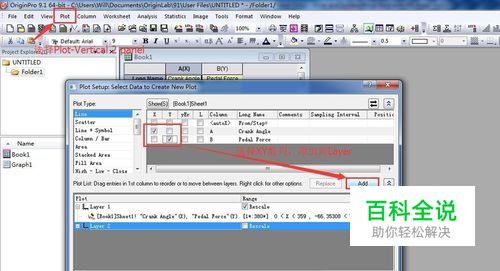(1)双屏图 执行Plot-Multi Curve-Vertical 2 Panel,弹出如图所示的对话框,选择XY数据,添加到Layer1和Layer2,点击Add就可以。