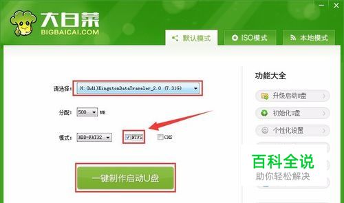 将u盘插入电脑usb接口,点击打开下载并且安装好的大白菜装机版,稍等片刻等待u盘成功读取到大白菜装机版界面之后,勾选“ntfs”并且点击“一键制作启动U盘”