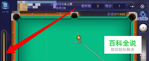使用球杆开始击球时,球上方有一个向标,代表击球后的方向。