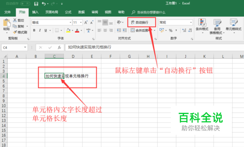 方法1 Excel中“自动换行”按钮的使用:打开Excel软件,在任意一单元格內输入想输入的文字。当输入的文字长度超过单元格长度,此时用鼠标左键单击“自动换行”按钮,即可实现换行。如图所示: