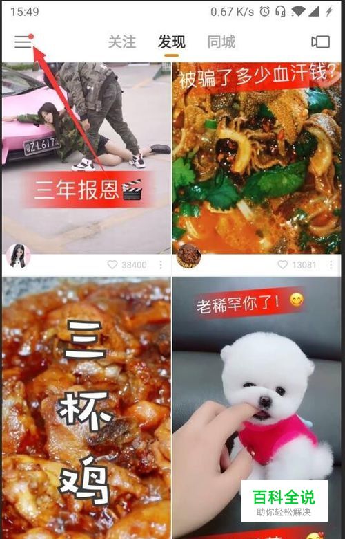 首先我们打开快手,然后在视频的首页中的左上角找到 三 标志,点击这个标记
