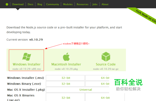 下载安装文件, 官网地址http://www.nodejs.org/download/ Windows环境下有两种版本可供选择,.exe和.msi版本。这两个的区别在于.msi文件在安装时会自动将node.exe增加到PATH路径下,其余的大致相同,推荐使用msi版本直接安装。