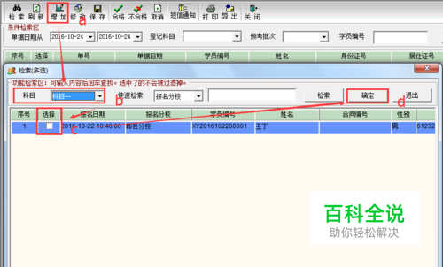 考试结果登记 记录科目一、科目二、科目三、科目四考试成绩 操作步骤:a. 点击【增加】按钮;b. 选择考试科目,系统会自动筛选对应科目可考试人;c. 勾选对应人员;d.点击“确定”按钮,系统会自动带入对应的学员信息; e.录入批次、准考证号、考试时间、考试结果信息; f.点击【保存】按钮