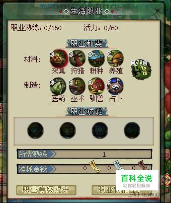 选好学哪个职业之后,点“职业等级提升”,然后把熟练度全点上去就行了。随着职业等级提升,对应的技能图标会亮起来,在描述上找到需要干的事情,干完就可以得到材料了,材料可以卖给粮草官,也可以摆摊子卖,区别就在于卖粮草官是系统价,而摆摊子卖可以试下摆摆比系统更高的价。