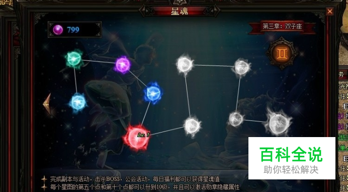 《暗黑屠龙》星魂升级星点的玩法: 1、每张图的第五个星点与第十个星点都能进行升级,共可以升10级,升级星点消耗战魂值。 2、星点在升级前必须为已激活状态,激活后升级为独立部分,只要被激活即可以激活下一个点。 3、星点升级后将增加属性效果,大点升到5级、10级时勋章将激活相应的隐藏属性,只有大点升级到5级和10级时才会触发相应的勋章属性,属性为单一类型。