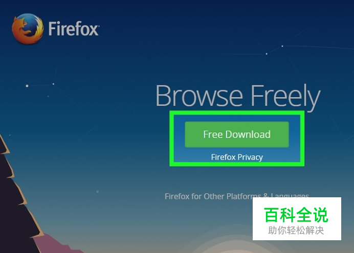 访问火狐浏览器的官方网站。页面中绿框的下载链接会自动检测设备的操作系统和语言。 如果你想要下载其它语言或其它操作系统版本的火狐浏览器,你可以点击下载按钮下方的“系统和语言”链接来进行选择。