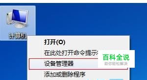 在Windows7系统桌面上,右击计算机,选择“属性”或“设备管理”,单击弹出的对话框左上角的“设备管理器”。