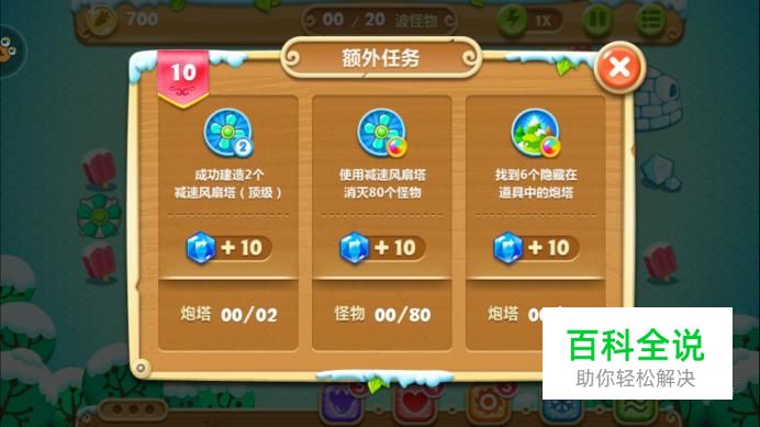 我们先来看一下额外任务,分别是“成功建造2个减速风扇塔(顶级)”,“使用减速风扇塔消灭80个怪物”和“找到6个隐藏在道具中的炮塔”,难度主要在最后一个,不过小编会教大家如何达成这个任务哦。