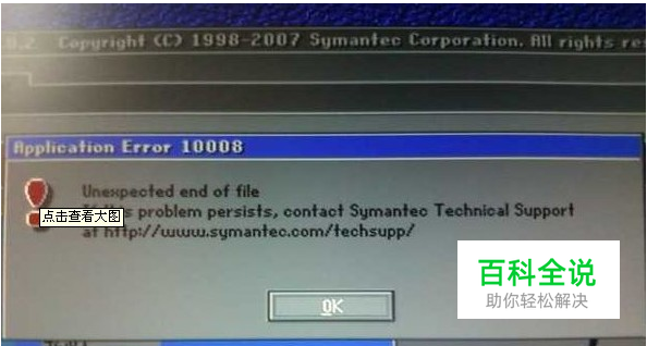 使用U盘来制作启动盘已经是现在安装系统的最普遍的方法,而最近有网友反映到用U大侠安装ghost系统的时候出现application error 10008错误的提示窗口是怎么回事?下面小编来为大家提出解决方案。 一位用户,说他进入u大侠pe系统,准备安装ghost系统,当运行“u大侠pe一键装机”还原ghost系统的过程中弹出了一个错误的窗口,如下图:application error 10008错误 错误窗口的详细信息如下: 标题上显示:Application error 10008 一个很大的红色感叹号,内容框里面显示: Unexpected end of file If this problem,contact Symanteo Technical Support at http:// www.symantec. com/techsupp/ 在小编的要求下,该用户又给小编提供了一张清晰的图片,如下图:application error 10008错误 当初先这样的窗口后点击确定却没什么反应了。接连换了好几个系统安装都一样出现这样的问题,这是怎么回事呢? 为此小编针对此类问题进行了分析,总结出了以下几种可能导致的问题,并给出了对应的解决方案: 问题分析一:u盘容量已经用完; 解决问题一:删除u盘里面一些无用的文件,让u盘保留一定的空间! 问题分析二:内存损坏或者其他问题; 解决问题二:先关机,拔出内存条,用橡皮筋擦拭一下插入插槽处的地方。或者更换内存条试试! 问题分析三:硬盘有坏道或者其他问题; 解决问题三:检查硬盘使用有坏道,如果没有坏道那就低格式化一次硬盘,重新分区! 问题分析四:硬盘有隐藏分区; 解决问题四:删除该隐藏分区即可。 问题分析五:复制gho文件的时候出了问题,ghost文件损坏了; 解决问题五:重新复制gho文件到u盘里面,或者重新下载一个ghost系统。 问题分析六:系统盘(C盘)有问题; 解决问题六:在PE下手动格式化一次系统盘(C盘)。 问题分析七:打开PE里面的“我的电脑”找不到本地磁盘的盘符; 解决问题七:重启电脑,进入BIOS设置,把默认的硬盘模式AHCI改为SATA模式。 如果上述解决方法还不能把问题解决的话,大家可以进入BIOS设置,CMOS选择第二项,把VIRUS WARRING这个选项设为DISABLE,然后保存重启试试! 用U盘制作工具来制作启动盘时,总是会遇到各种状况,但都是小问题,可以解决的。U盘装系统出现application error 10008错误的提示窗口可能有七种情况,而小编对这七种情况提供了一一解决的方案。
