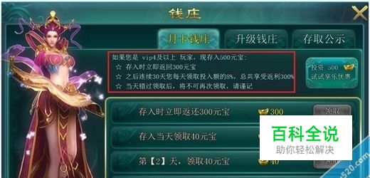 仙战钱庄系统详解 功能介绍 有没有想过在游戏里能够不劳而获轻松赚钱?有没有想过一个非R或者小R也可以在游戏里每日都有元宝使用?大闹天宫的钱庄系统,正是我们为广大玩家提供的这样一个场所! 钱庄是以每日领取和等级领取元宝的一种方式,比如玩家前期投入了一定的元宝,玩家通过每日领取或在游戏内升级可以领取翻倍的奖励!最高可以领取5倍的收益!真正的几倍回报率,回报力度可是超过任何一种投资哦!如果玩家前期投资的少,还可以追加补领! 好了,介绍了那么多,接下来让我们详细的看看钱庄内的一些具体功能吧! 1、钱庄开启需要玩家等级到达46级后,开启后玩家点击页面右上角活动然后点击钱庄 2、打开钱庄页面后可以看到钱庄分别为【月卡钱庄】和【升级钱庄】,下面我简单的说一下钱庄吧~ 【月卡钱庄】 月卡钱庄就是玩家存入一批元宝,该元宝会在30天内返还给玩家, 返利数额: 用户存入的当天可以领取已存入的本金:500元宝(该元宝为固定数额); 第一天(当天)可以领取返利300元宝 之后的29天,每天可以领取40元宝。