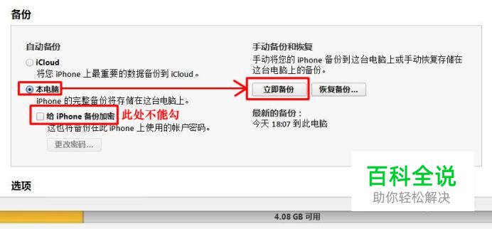 首先需要备份一下苹果手机数据:将苹果手机用数据线与电脑进行连接,待手机与电脑成功进行连接后运行iTunes软件,再勾选备份栏目中的本电脑项,再点击立即备份按钮等待备份完成。 注意:备份数据时不能加密备份。