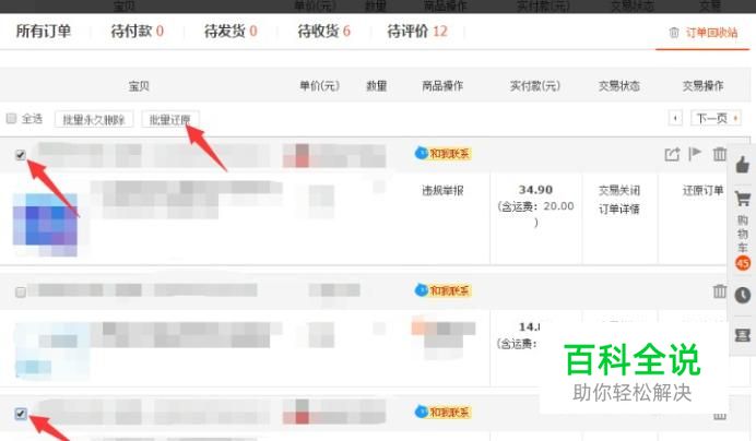 如果需要回复多个订单,勾选要恢复的订单,点击 批量还原订单 ,返回我的淘宝也就可以查看。